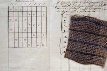 le armature licci, quaderni di tacamenti”. Il verbo “tocar” indicava il legare fra loro liccio e pedale del telaio secondo un ordine prestabilito per fare l’armatura di base. La parola “attaccamento” e il disegno dell’armatura licci che la segue ricordano, ad esempio, l’opera realizzata da due tessitori pesaresi del XVII secolo, Alessio e Berardino Didi, ovvero due manoscritti in cui trascrissero i “tacamenti” (le armature licci) delle stoffe da loro prodotte e sperimentate. Grafico dei Tacamenti: Schemi delle armature e dei disegni. ...