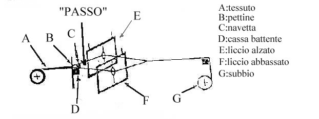 passo dell'ordito, il tessuto ed il rullo di avvolgimento del tessuto.