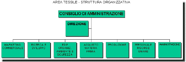 CONSIGLIO DI AMMINISTRAZIONE - determina le politiche aziendali. DIREZIONE sulla base delle decisioni del CdA elabora programmi e coordina le attività aziendali. MARKETING e COMMERCIALE - analizza i mercati, prevedendone i bisogni, contatta i clienti per la vendita dei prodotti, stabilendo con loro un rapporto collaborativo, nel reciproco interesse. RICERCA e SVILUPPO - studia nuovi prodotti, produce campionari e prototipi, assiste i clienti per lo sviluppo delle attività. EDP, ORGANIZZAZIONE, AMBIENTE/SICUREZZA - mette a punto e mantiene aggiornata l'informatizzazione aziendale, cura l'organizzazione di reparti e servizi, cura l'applicazione delle normative sull'ambiente e sicurezza lavoro. PRODUZIONE realizza i programmi produttivi previsti per i diversi reparti, nel rispetto dei tempi e dei parametri qualitativi prefissati. ACQUISTO MATERIE PRIME su indicazione della Direzione approvvigiona le materie prime necessarie ad ogni tipo di attività (fibra greggia o semilavorata, filati, tessuti). PERSONALE e RISORSE UMANE - cura le pratiche relative all'amministrazione del personale, procede alla valutazione, formazione e valorizzazione dei dipendenti.